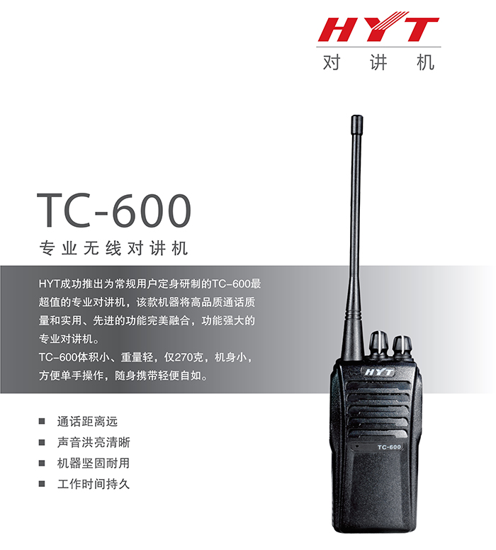 HYT成功推出为常规用户定身研制的海能达对讲机TC-600专业对讲机,该款机器将高品质通话质量和实用、先进的功能融合,功能强大的专业对讲机。 TC-600体积小、重量轻,仅270克,机身小,方便单手操作,随身携带轻便自如。
